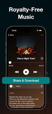 Dive into Musical Exploration: Our app's deep knowledge of musical styles lets you mix and match genres in exciting and innovative ways. Create unique, royalty-free songs ready to share anywhere.